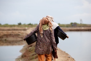 Women walk between shrimp ponds in Aceh, Indonesia. Fish farms help post-tsunami villages in Aceh.  (Photo by Mike Lusmore) Photo used under CC BY