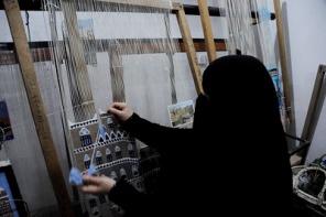 A Yemeni woman weaves on a loom at the National Women’s Handicraft Center for Development of Handicrafts.
