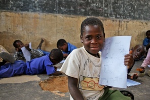 Gift, age 8, shows his school work at the Matau Primary School in Matau village in Zimbabwe. The school has few desks, so the children sit on the floor.