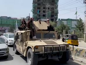 Taliban fighters in a captured Humvee after the fall of Kabul in 2021.  (Photo by Voice of America News) Photo used under CC BY