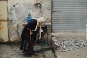Fatima, a resident of Raqqa city, living in a Northern Syrian displacement camp, checks the water tap in her house.