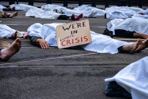 Healthcare workers participate in a “die-in” protesting the climate crisis at the Victorian Parliament in Melbourne, Australia.  (Photo by Matt Hrkac) Photo used under CC BY