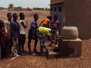 Kids line up to wash their hands at a school in Burkina Faso.  (Photo by Tontama Sanou) Photo used under CC BY