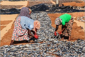 Women lay fish out to dry in the sun at Negombo Fish Market, Sri Lanka.  (Photo by Maureen Barlin) Photo used under CC BY