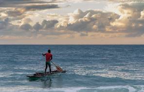 A fisherman’s bamboo pole raft as seen from the Macaneta shore in Mozambique.  (Photo by Andrew Moore) Photo used under CC BY