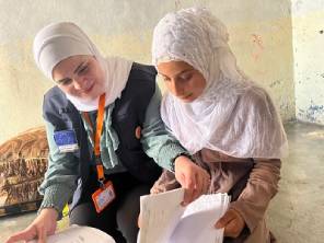 Soha, the WeWorld-GVC education coordinator, sits with one of the girls who is enrolled in the EU-funded self-learning program in northern Jeb Abyad, rural Aleppo. The aim is to reach out-of-school children and transition them into formal education.  (Photo by Anouk Delafortrie/European Union) Photo used under CC BY