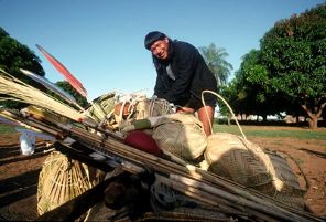 Paulo Shavante, “Vice-cacique” (vice leader), of the Shavante Indian tribe, with crafts made by the villagers.