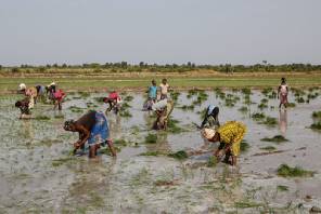 Women in Baguineda, Mali, work in a rice field.  (Photo by CTA ACP-EU) Photo used under CC BY