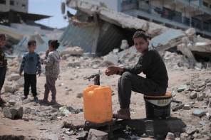 Palestinian children access water among the rubble from war.  (Photo by UNRWA) Photo used under CC BY