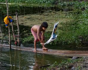 A young monk washing on Majuli Island, India.  (Photo by Rod Waddington) Photo used under CC BY