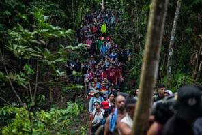 A group of migrants gets stuck in a human traffic jam while climbing Banderas hill at the Darien Gap.